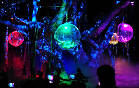 (4)在舞美灯光设计的创新上,夜晚的黑暗不仅不会制约时空的变化,反而会变为一块“画布”,通过极光、灯光、大屏幕投影制造出时空隧道、白昼或群星闪耀;LED灯带变化出成千上万的萤火虫,营造出草木皆有灵的壮观场面。